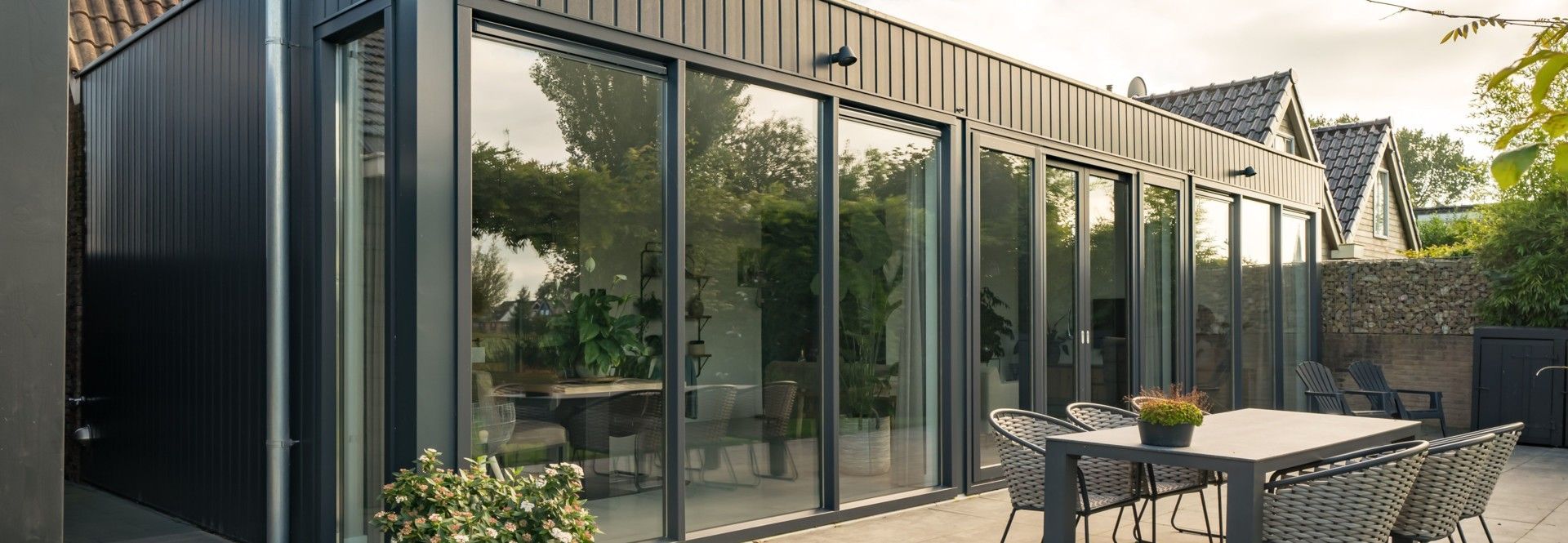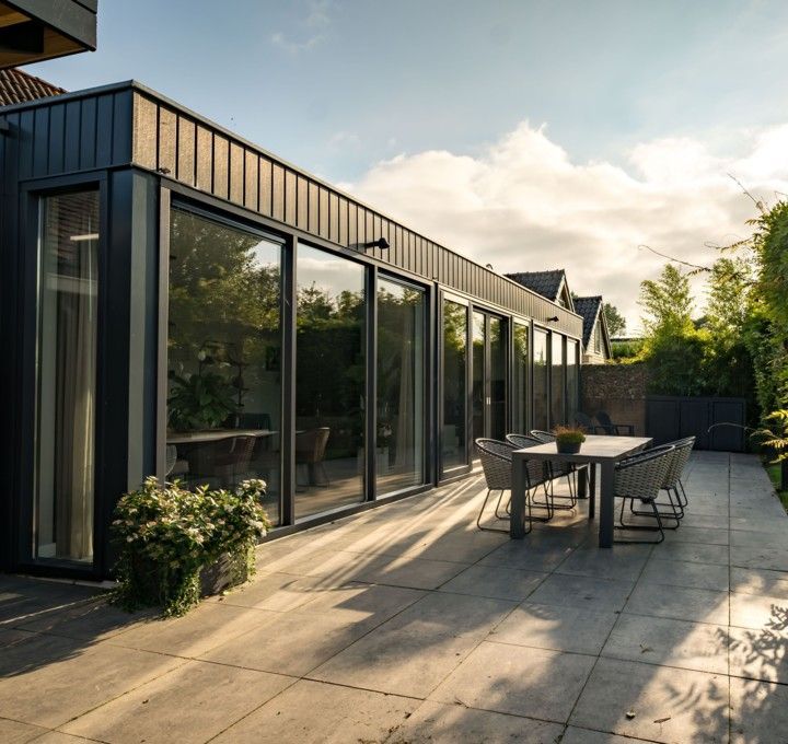 De verouderde basiswoning moest compleet gerenoveerd worden om bewoning mogelijk te maken, in dezelfde fase is er een zeer ruime uitbreiding achter de woning geplaatst. Met vrij uitzicht aan de achterzijde is er gekozen om deze gevel geheel uit te voeren in kunststof kozijnen, beide zijgevels zijn blind uitgevoerd met relatief onderhoudsarme kunststof gevelbekleding. Met behulp van enkele stalen portaalcostructies is er een geheel gecreëerd tussen de basiswoning en de moderne uitbreiding.